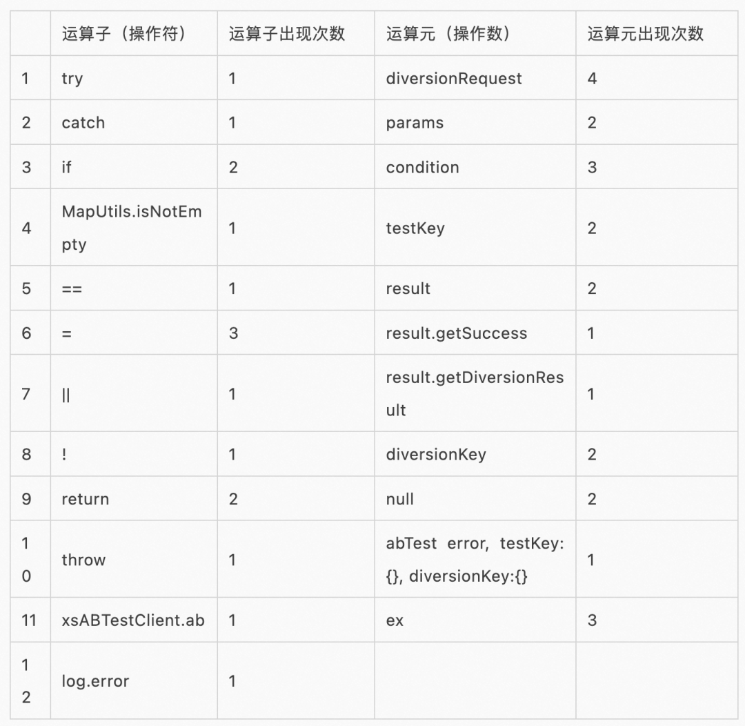 我们梳理这段代码中的预算子和运算元以及分别统计出其个数: