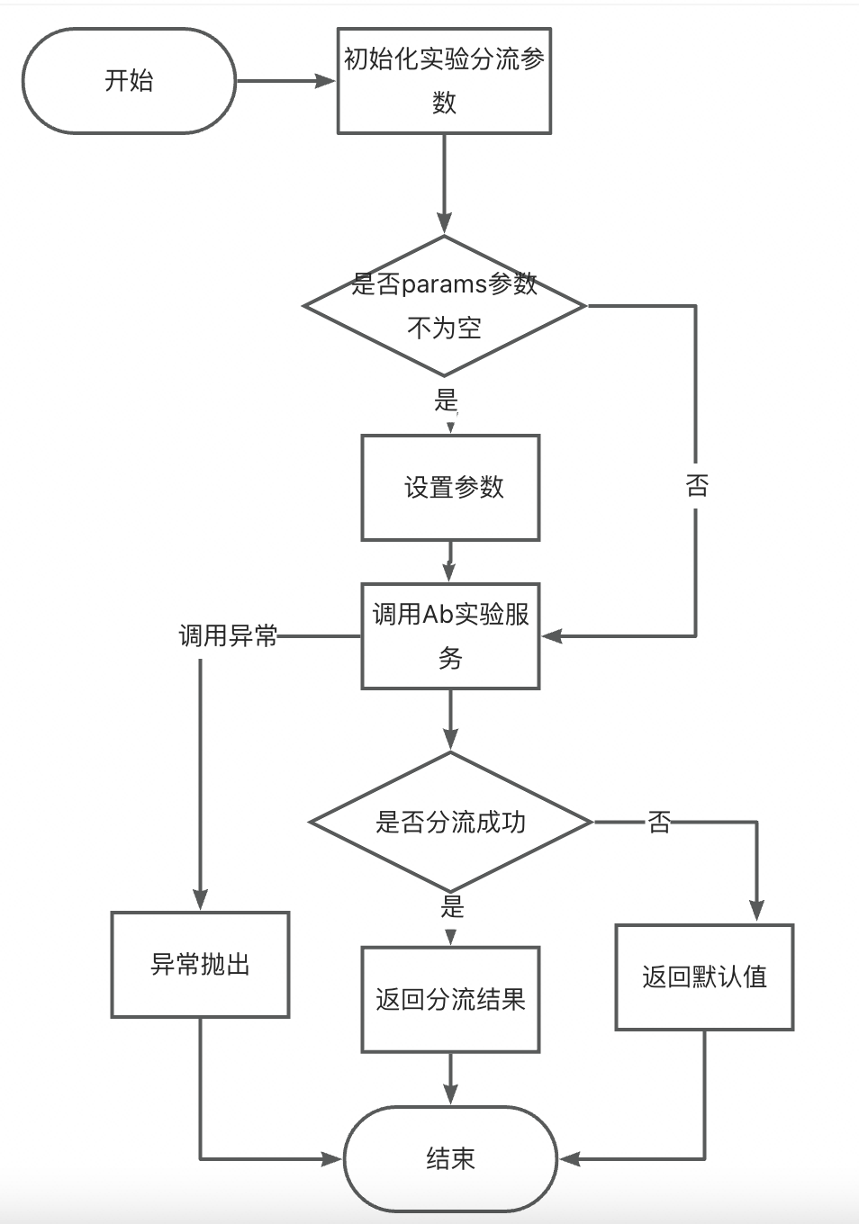 try {DiversionRequest diversionRequest = new DiversionRequest();diversionRequest.setDiversionKey(diversionKey);if (MapUtils.isNotEmpty(params)) {DiversionCondition condition = new DiversionCondition();condition.setCustomConditions(params);diversionRequest.setCondition(condition);}ABResult result = xsABTestClient.ab(testKey, diversionRequest);if (result == null || !result.getSuccess()) {return null;}return result.getDiversionResult();} catch (Exception ex) {log.error("abTest error, testKey:{}, diversionKey:{}", testKey, diversionKey, ex);throw ex;}