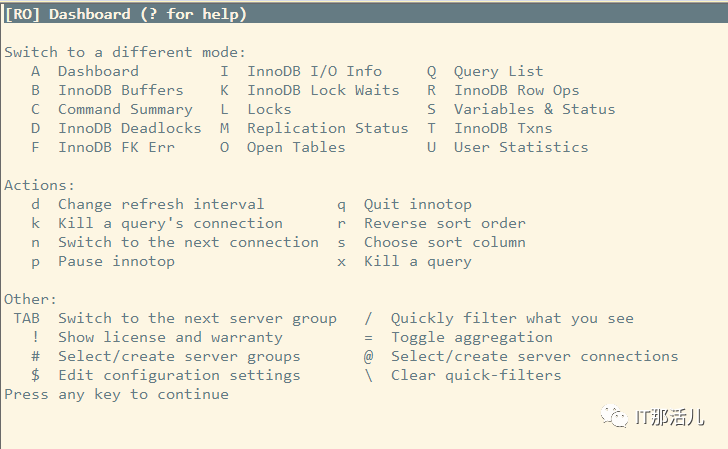 使用innotop连接数据库,进入交互式操作界面后,可输入不同工作模式的快捷键,进行切换工作模式。可输入“?”查看如何进入各种工作模式,如下图所示。