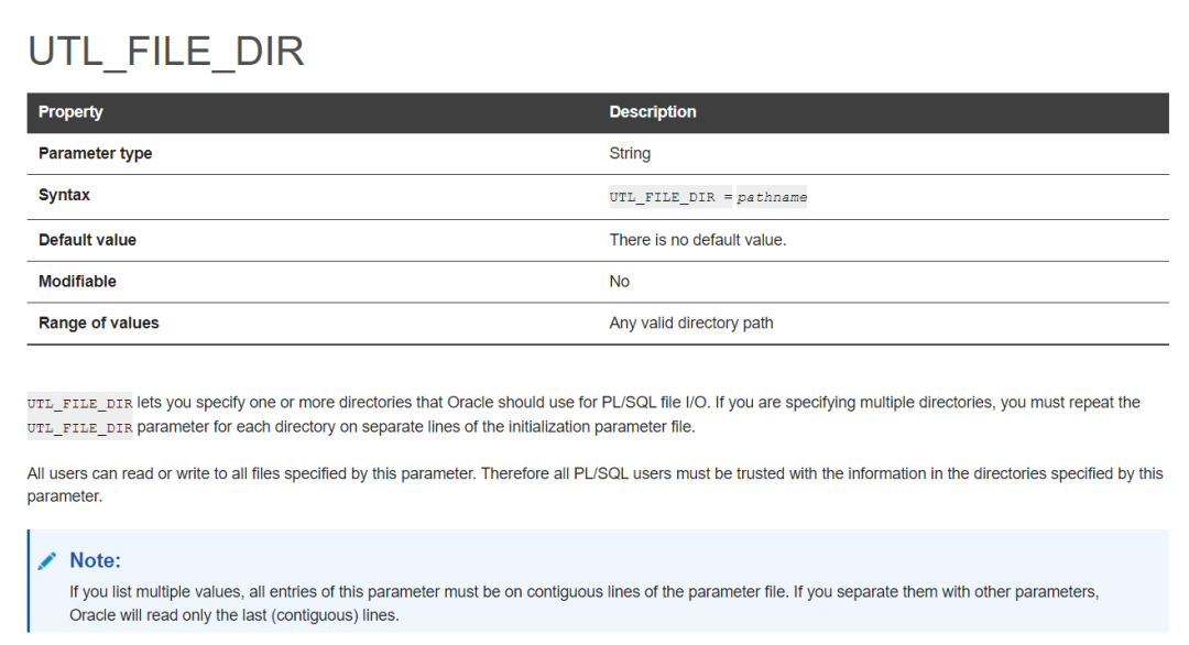 我们通过官方文档可以找到一些线索,11g的《Reference》说UTL_FILE_DIR的意思是可以设置PL/SQL中操作文件的目录路径,特意强调了所有的用户都可以读写这个参数定义的文件,