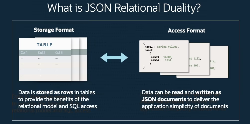 JSON Relational Duality 有助于结合文档和关系世界的优点。开发人员通过关系模型的存储效率和功能获得 JSON 文档模型的灵活性和数据访问优势。