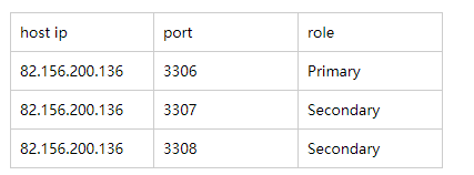 mysql> select * from replication_group_members; +---------------------------+--------------------------------------+----------------+-------------+--------------+-------------+----------------+ | CHANNEL_NAME | MEMBER_ID | MEMBER_HOST | MEMBER_PORT | MEMBER_STATE | MEMBER_ROLE | MEMBER_VERSION | +---------------------------+--------------------------------------+----------------+-------------+--------------+-------------+----------------+ | group_replication_applier | 519dc1a6-be2b-11ec-9f85-525400743c33 | 82.156.200.136 | 3307 | ONLINE | SECONDARY | 8.0.20 | | group_replication_applier | 9915aff5-bbd6-11ec-9110-525400743c33 | 82.156.200.136 | 3306 | ONLINE | PRIMARY | 8.0.20 | | group_replication_applier | 9aa1cbcd-be2c-11ec-90a8-525400743c33 | 82.156.200.136 | 3308 | ONLINE | SECONDARY | 8.0.20 | +---------------------------+--------------------------------------+----------------+-------------+--------------+-------------+----------------+ 3 rows in set (0.00 sec)复制