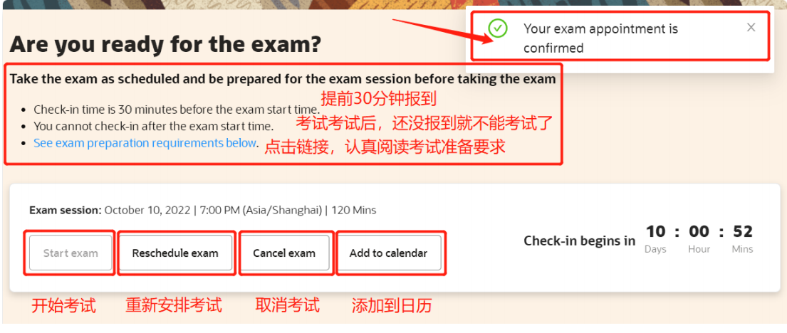 准备好证件,在一个安静的环境中准备考试,考试是要求环境不可以有其他电子产品(手机),书这些,具体的在前面邮件的 your exam space中查看到。在预约考试的前30分钟,需要点击邮件中的 check-in,进入准备考试。点击check-in会跳转到mylearn的页面去,然后点击 start exam,