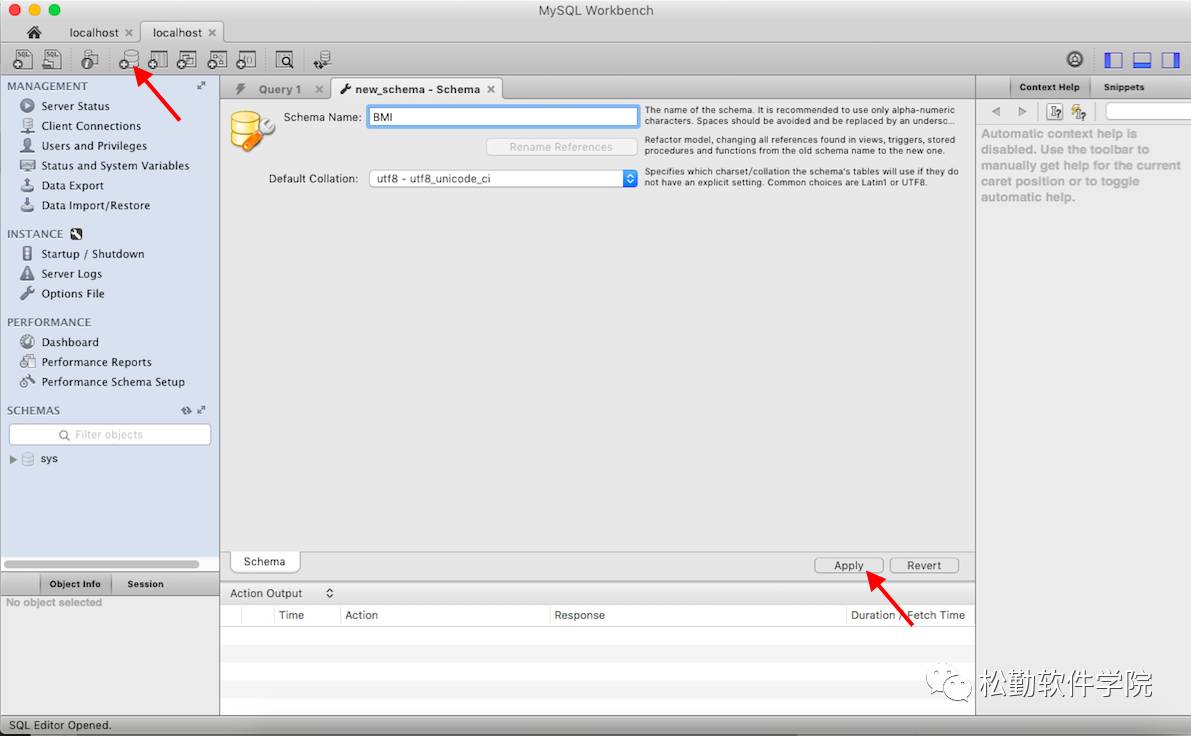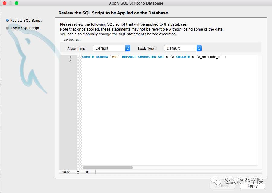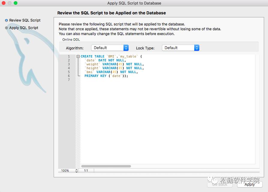 Workbench会自动生成SQL语句,再次点击Apply就可以成功创建数据库: