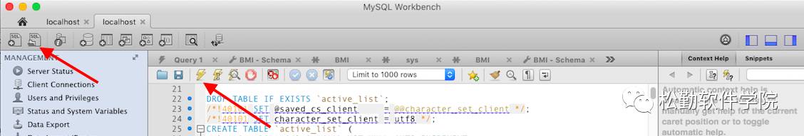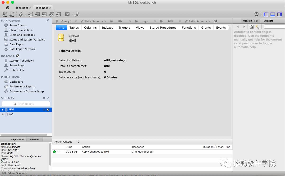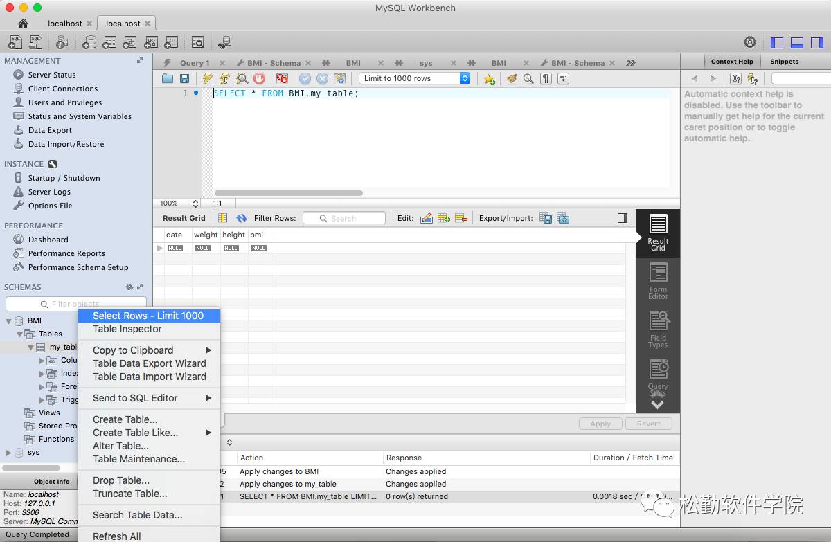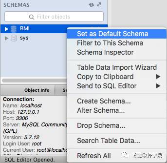 右键新建的数据库BMI,设置为此次连接的默认数据库,接下来的所有操作都将在这个数据库下进行:
