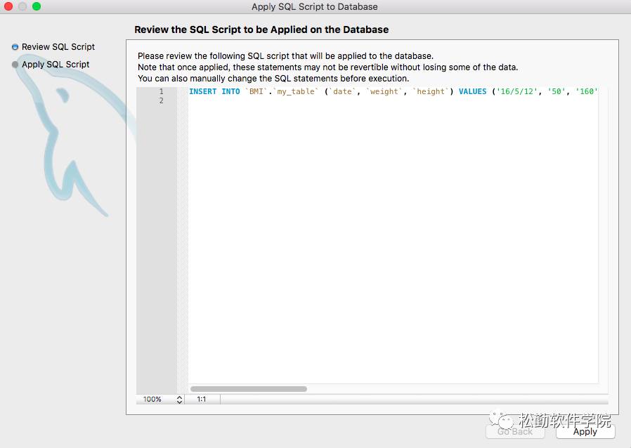 双击NULL处,即可写入数据,点击Apply,Workbench再次自动生成SQL语句,点击Apply,即可将数据写入表中: