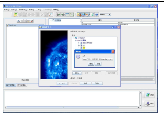 添加引用窗口 假设: Server1 为父:Server1 的 IP 为 192.168.0.208 端口为 389,其根节点为 o=china Server2 为子:Server2 的 IP 192.168.0.202 端口为 389,其根节点为 ou=tianjin,o=china. 父服务器 Server1 上必须要有条目 ou=tianjin,o=china 且条目内容如 下: