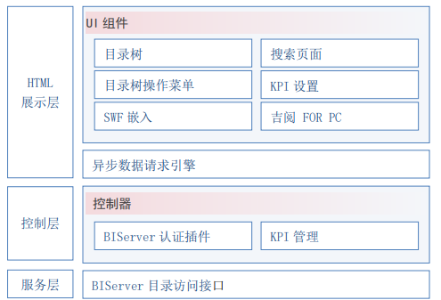 GBaseBI 是基于 B/S 构架,浏览器端负责数据查询设计和展示,服务器端提供数据查询等服务,产品模 块在上一章产品构架节中得出,产品包括门户、吉阅、吉查、吉图和 BIServer 和数据查询 gData 模块,gData 模块对用户是透明的,本章将详细介绍各个模块的构架和主要特色功能。