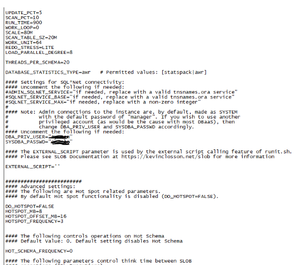 通过配置slob.conf,你可以修改负载的属性,包括表扫描的大小和UPDATE的比例。从而调整压力的负载类型。起到不同场景的压测作用。