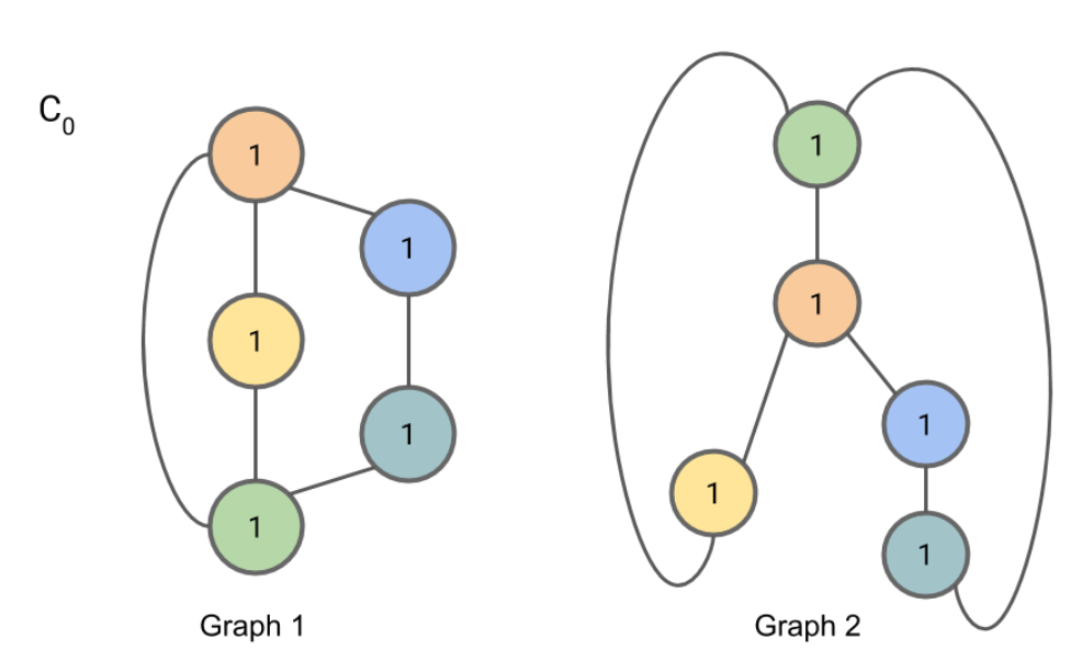 图1和图2的颜色表示在 WL 测试结束后的颜色分配,而初始时我们把所有节点都分配成一样的颜色,即 :