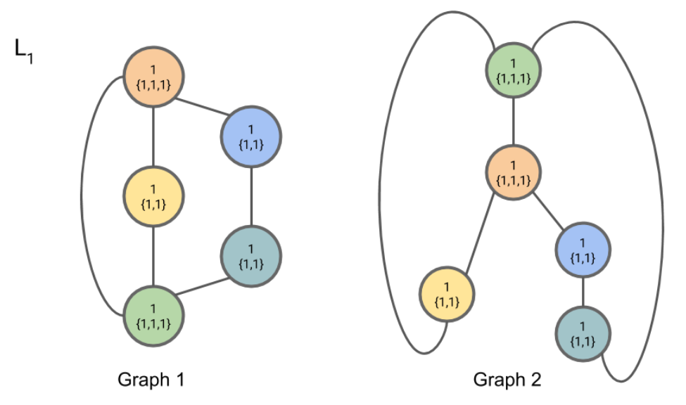 该算法中,我们首先对所有节点都赋予一个“颜色” (如果节点有输入的特征 ,那么根据不同的特征赋予不同的颜色)。而后,我们根据每个节点的邻居节点的颜色,去更新该节点在下一次迭代时的颜色。这里的哈希函数 必须是单射的,即它将不同的输入映射到不同的输出。