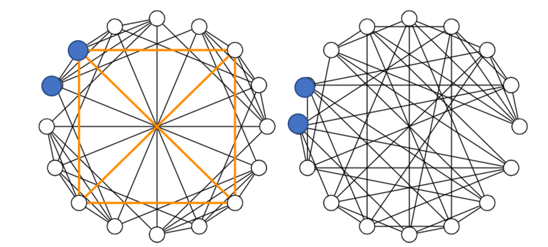 上图分别为 Rook's 4x4 和 Shrikhande 图。假设目标链接为蓝色节点对。2-FWL测试无法区分两个链接,而使用上述的 labeing trick 后,1-WL 测试即可区分两个链接。