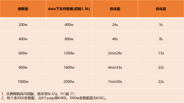 1.1 Buffer Pool Online Resize能力PostgreSQL的社区版本在修改包括shared buffer在内的很多参数时,都是重启才能生效的。RDS PostgreSQL Serverless内核通过深度优化,实现了shared buffer的在线扩缩容能力,保证了在整个扩容或缩容的过程中,极致平滑业务无感,即使是业务高峰期也丝毫不受影响。由于该部分技术细节涉及到专利,目前暂时不方便透露。1.2 优化海量表实例启动速度,从数分钟缩短至30秒内RDS PostgreSQL深度优化内核启动速度,在千万数量级的表文件下,内核启动时间由数分钟级缩短到 30 秒内。这大大优化了实例启动速度,方便实例在暂停状态下快速启动。
