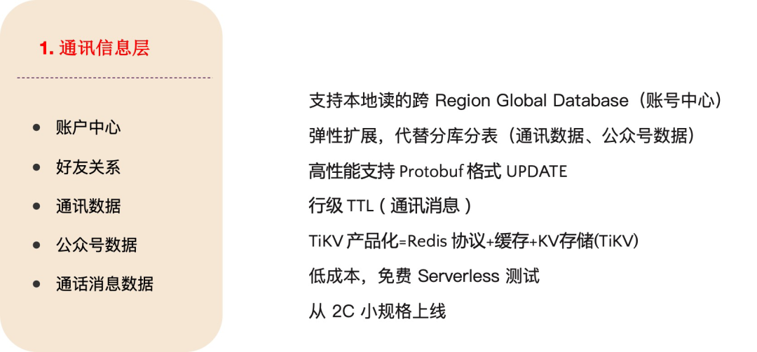 在通讯信息层的账号中心功能上,对于面向出海的应用来说,用户的分布往往是在不同国家和地区,对此, TiDB 可以支持本地读的跨 Region Global Database,用户可以在本地完成数据身份的验证;对大数据量的通讯来说,TiDB 也提供了弹性的扩容能力,用户不需要分库分表来打散数据,可以针对不同的 TiDB 组件进行扩容,比如在计算能力不足时可以扩容 TiDB Server,存储能力不足时可以扩容 TiKV 节点,AP 能力不足时可以扩容 TiFlash 节点,是非常灵活的。在一些对于消息有时效性要求的场景中,TiDB 也提供了基于 TTL 的行功能,方便对于数据的清理。另外,针对该行业的初创企业,TiDB 提供的 Serverless 可以帮助用户最大化节省成本。