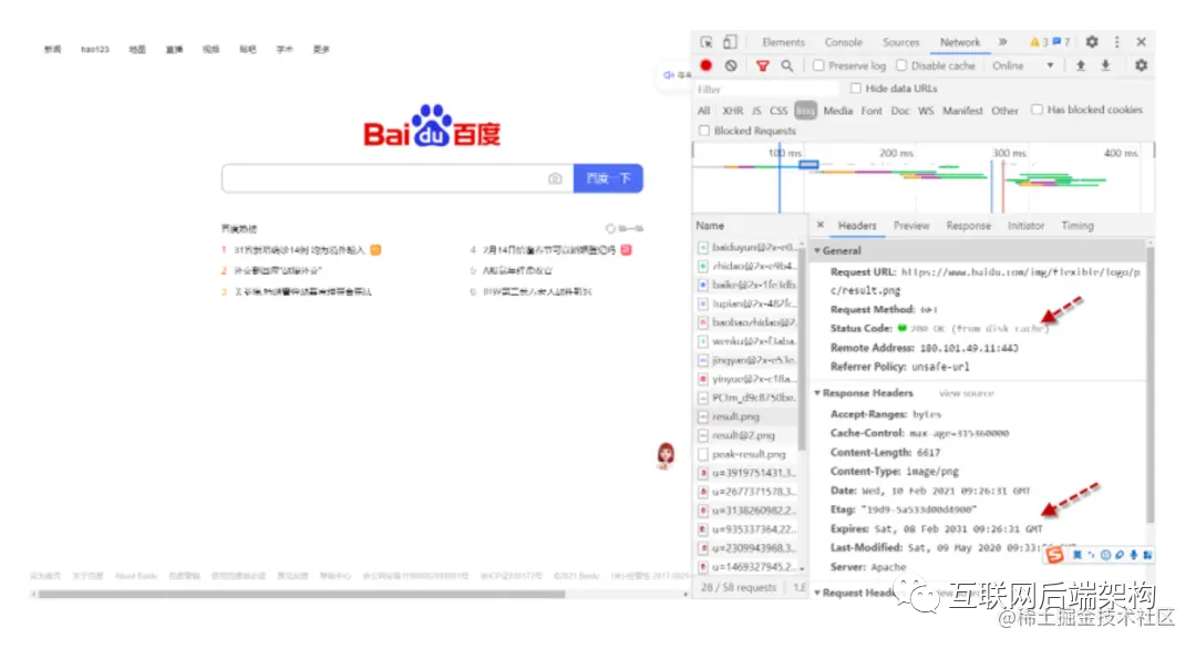 我们以百度 Logo 图片为例,百度在 HTTP 通过 Expires 响应头控制静态图片的有效期。Expires 代表过期时间。当前百度 Logo 的过期时间为 2031 年 2 月 8 日 9 时 26 分 31 秒。在这个时间段内,浏览器会将图片以文件形式缓存在本地,再次访问时会看到“from disk cache”的提示,此时浏览器不再产生与服务器的实际请求,会从本地直接读取缓存图片。通过在浏览器端设置 Expires 可以在很大程度减少重复请求静态资源带来的带宽损耗,这在高并发 Web 应用中是基础而重要的设置。