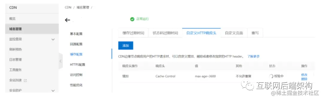 在互联网应用中,因为 CDN 涉及多地域多节点组网,前期投入成本较高,更多的中小型软件公司通常会选择阿里云、腾讯云等大厂提供的 CDN 服务,通过按需付费的方式降低硬件成本。而这些服务商又会为 CDN 赋予额外的能力,比如阿里云、腾讯云 CDN 除了缓存文件之外,还提供了管理后台能为响应赋予额外的响应头。如下所示在阿里云 CDN 后台,就额外设置了 Cache-Control 响应头代表缓存有效期为 1 小时。这里我们额外提一下 Expires 与的 Cache-Control 的区别,Expires 是指定具体某个时间点缓存到期,而 Cache-Control 则代表缓存的有效期是多长时间。Expires 设置时间,Cache-Control 设置时长,根据业务场景不同可以使用不同的响应头。