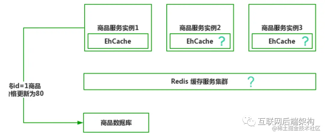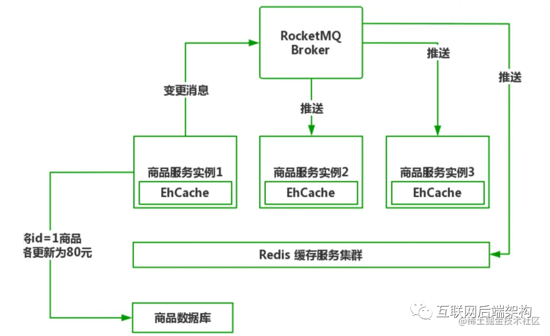 我们都知道作为数据库写操作,是不通过缓存的。假设商品服务实例 1 将 1 号商品价格调整为 80 元,这会衍生一个新问题:如何主动向应用程序推送数据变更的消息来保证它们也能同步更新缓存呢?