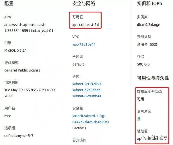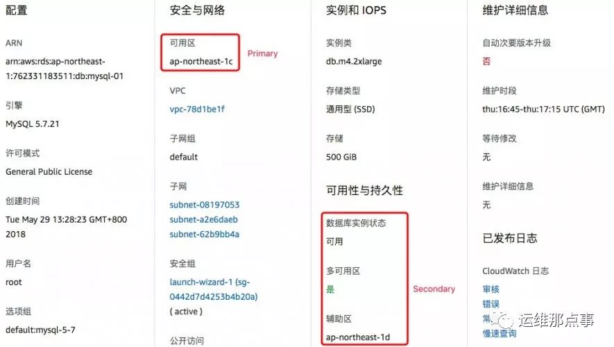 在具有多可用区的Amazon RDS中,详情部分呈现了主要可用区(称为可用区)和辅助可用区(称为辅助区)。