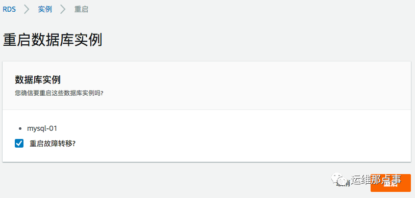 现在让我们通过重新启动模拟一个场景,我们将使辅助区域成为可用区。选择重启实例,通过重启故障转移来测试。