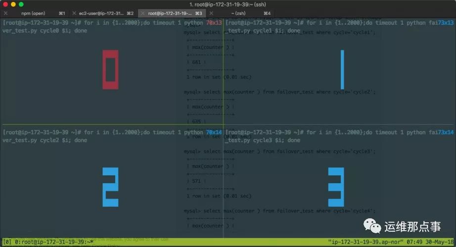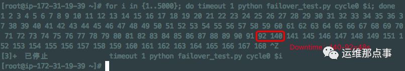 然后启动故障转移,此时所有命令执行界面都应该为停止状态,最后一个数字就是我们插入到主库的的数据条数。