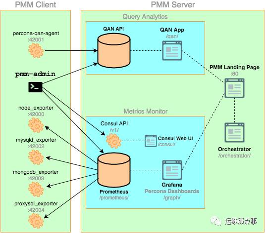 PMM Client是安装在你要监视的MySQL或MongoDB主机上的一组代理组件。组件收集关于一般系统和数据库性能的各种数据,并将该数据发送到相应的PMM服务器组件。