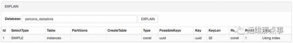 详细信息部分使您可以EXPLAIN直接从PMM Web界面(仅指定数据库)在所选查询上运行。