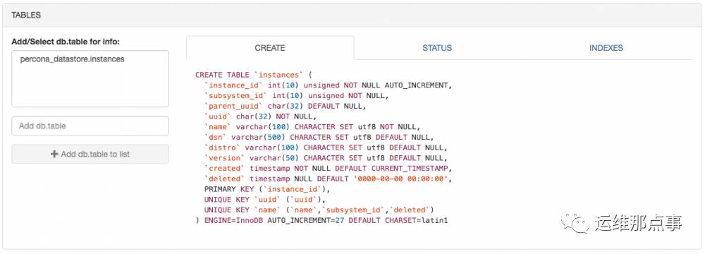 你可以在底部为所选查询运行“表信息”,这使你能够获得,以及通过直接从PMM Web界面查询使用的每个表:SHOWCREATE TABLESHOW INDEXSHOW TABLE STATUS