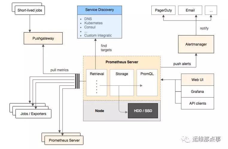 该图说明了普罗米修斯(Prometheus)及其一些生态系统组件的整体架构: