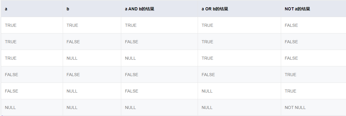 常用的逻辑操作符有AND、OR和NOT,他们的运算结果有三个值,分别为TRUE、FALSE和NULL,其中NULL代表未知。他们运算优先级顺序为:NOT>AND>OR。