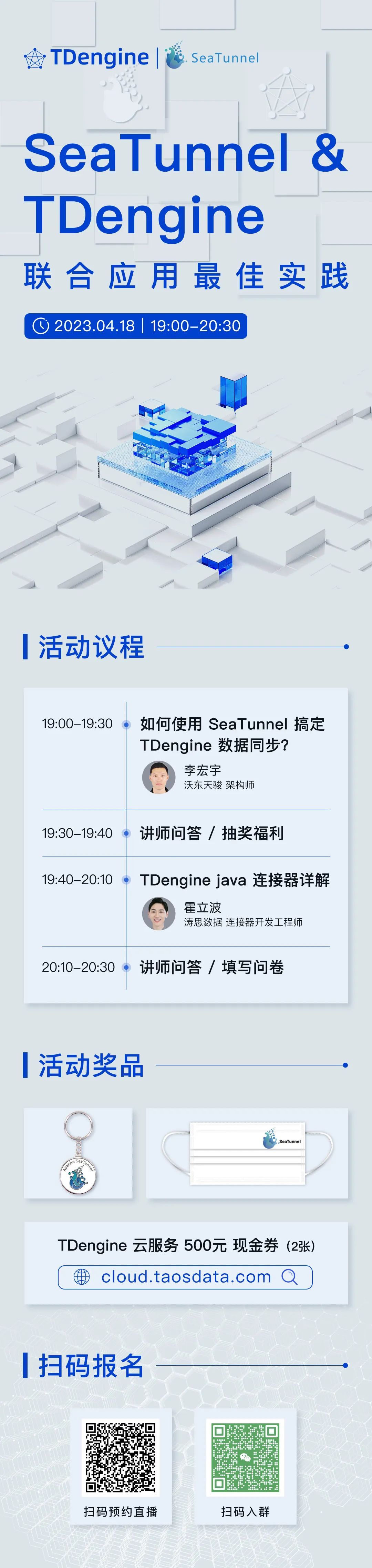 Apache SeaTunnel 线上系列技术直播活动下周精彩继续!这次,社区与 TDengine 展开联合活动,分享两者集成应用的最佳实践。目前,Apache SeaTunnel Connector“方阵”已支持 TDengine Connector,将广泛涉猎物联网、工业互联网、金融、IT 运维监控等场景的数据库 TDengine 列入支持队列,无疑将进一步扩大 Apache SeaTunnel 的技术生态。两者联合将带来怎样的惊喜,欢迎关注 4 月 18 日即将到来的线上直播!