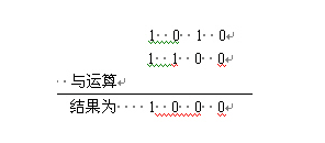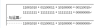 计算过程是这样的,将IP地址和子网掩码都换算成二进制,然后进行与运算,结果就是网络地址。与运算如下所示,上下对齐,1位1位的算,1与1=1,其余组合都为0。