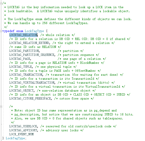因为并发访问所带来的一致性问题,所以引用锁机制来解决。最容易被我们感知的锁对象有行/表等,我们来看一下在PostgreSQL/opengauss里面哪些锁对象(LockTag).