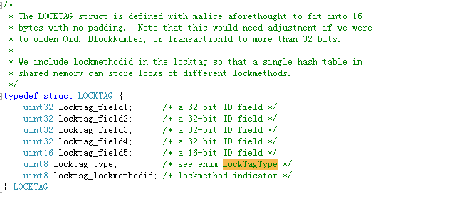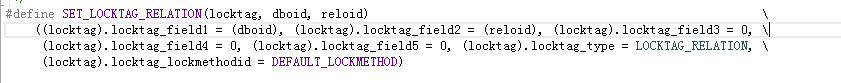 在LOCKTAG结构体中,表示锁对象的类型的字段为locktag_type,其他属性用来具体化这个对象,例如表的锁对象的宏定义如下: