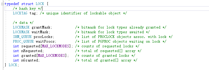 锁对象(locktag),是被锁保护的对象,现在我们来看看锁的结构,其中必含有锁对象属性的变量,这样才可以关联到锁保护的对象。锁,我们可以简单类比为某个锁对象的管理员, 他需要记录当前有哪些类型的操作已作用在这个对象上,以及哪些类型的操作还在等待中,等待被允许。下图是锁的结构体: