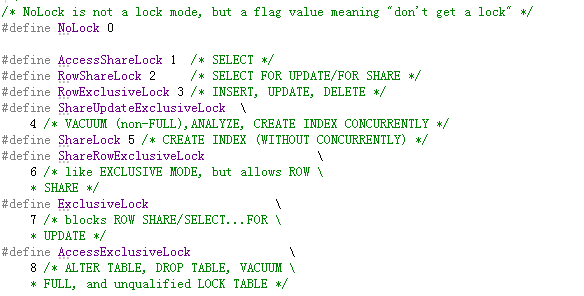 (ShareLock) | (ShareRowExclusiveLock) | (ExclusiveLock) | (AccessExclusiveLock)。需要提一点的是,锁跟锁之间是否冲突,是建立在同一对象上的,表锁跟行锁之间,不存在是否冲突的关系,因为它们不是同一对象。
