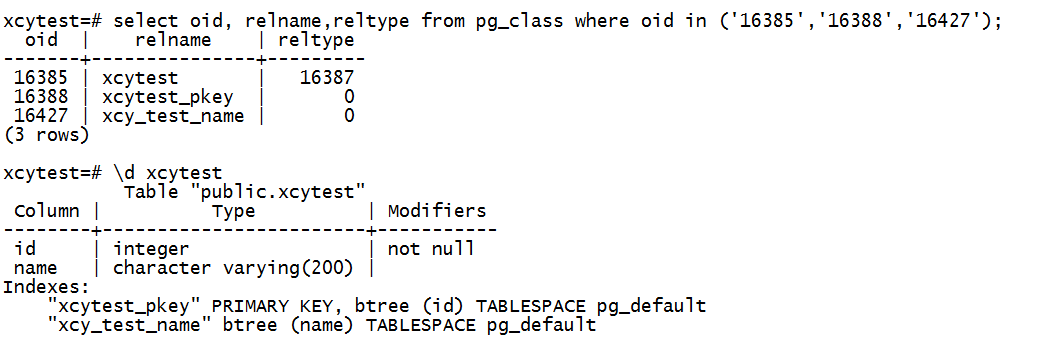 示列表中包含一个主键,一个普通索引。表,主键,普通索引的oid等信息如下图所示: