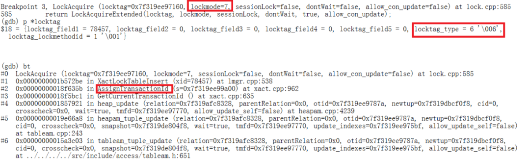 加锁的lockmode等于7, 也就是ExclusiveLock, 但locktag_type为6, 参考前面提到的锁对象种类的信息,6对应为LOCKTAG_TRANSACTION. 并非是行锁,查看调用栈,了解到是在执行assigntransactionid函数的时候加的锁,从字面意义来看,是分配事务id的时候加的锁。
