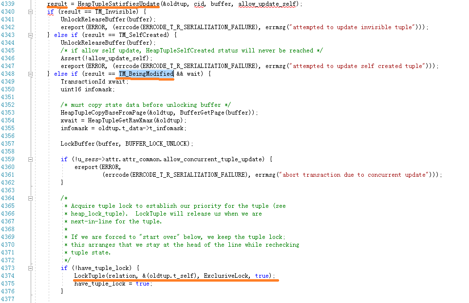 只有发现行正在被修改的时候,才会调用lockTuple函数,对行进行加锁,否则不会对被修改的行加锁。为了验证这个结论,我们启动两个会话,对同一行进行修改,先修改的会话先不提交事务,然后第二个会话再次修改该行,就会看到第二个会话的线程会执行lockTuple函数。