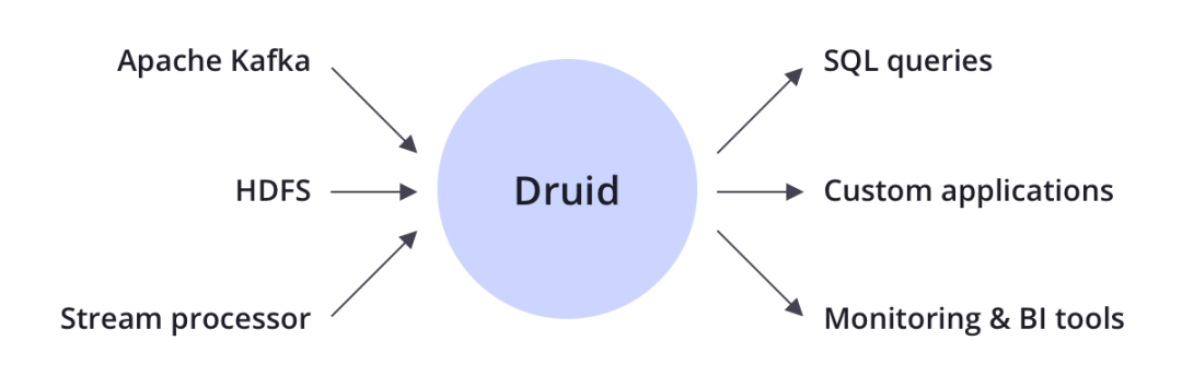 Druid作为流批一体的摄取中心,又服务于终端用户的查询或应用,因此它位于存储或处理层与终端用户之间,作为查询层服务于数据分析的工作负载。我们可以看到像Kafka、HDFS以及其他像Flink这样的流处理器都可以作为摄取源。