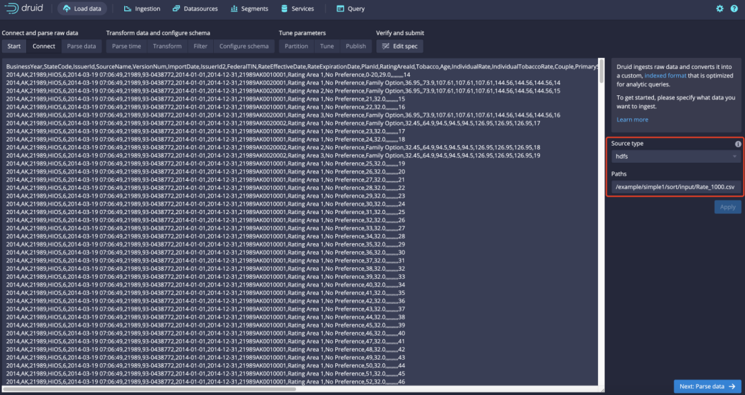 这个示例通过Hadoop HDFS来批量摄取数据,HDFS路径为:/example/simple1/sort/input/Rate_1000.csv,是一个CSV文件,我们可以看到指向该文件后,Druid就会对其进行解析。