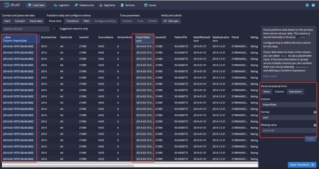 我们还可以看到在解析时间的阶段Druid会自动发现importDate列适合作为时序的时间戳_time。