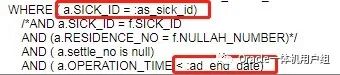 /*lxw 20130822 增加慢病类型*/ (select c.ICD_NAME from EEE b, FFF c, GGG t where b.prescription_number = t.PRESCRIBE_NUMBER and b.icd_code = c.icd_code and c.icd_class = '02' and t.apply_no = a.apply_no and b.sick_id = a.sick_id and rownum = 1) icd_name, /*慢病类型*/ (select u.unit_name from EEE b, HHH u, GGG t where u.unit_code = b.icd_code and b.prescription_number = t.PRESCRIBE_NUMBER and t.apply_no = a.apply_no and b.sick_id = a.sick_id and u.unit_type = '13' and u.valid_flag = 'Y' and rownum = 1) unit_name, /*下次取药时间->门诊慢病结算单打印需要*/ (select decode(nvl(d.day_count, -1), -1, '', to_char(sysdate + 1 + decode(a.item_class, 'C01', round(d.day_count/(select t.freq_count from JJJ t where t.FREQ_DESCRIBE_CODE = d.frequency) + 0.4, 0), d.day_count ), 'yyyy-mm-dd')) from KKK d, GGG v where a.apply_no = v.apply_no and a.sick_id = v.sick_id and v.prescribe_number = d.prescription_number and v.prescribe_sub_number = d.sequence_number and rownum = 1) next_date, a.import_price, a.import_money FROM LLL a/*, DDD f*/ WHERE ( a.SICK_ID = '0000000230') /*AND a.SICK_ID = f.SICK_ID AND (a.RESIDENCE_NO = f.NULLAH_NUMBER)*/ AND ( a.settle_no is null) AND ( a.OPERATION_TIME < date'2021-04-23') |