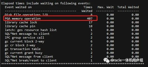 但是本案例中用的是Oracle一体机,硬件性能毋庸置疑,且只是其中一个PDB出现这个问题,发生故障时主机资源也很空闲,通过PDB的AWR报告也能看出PDB的PGA设置完全没问题,和Bug 27701460吻合,故建议:当出现"PGA memory operation"等待事件时不要盲目的去加大主机资源或者数据库PGA。