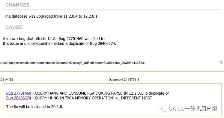 通过使用PGA memory operation关键字在MOS中查询,最终和MOS文档SelectHangs After Upgrade From 11.2.0.4 To 12.2.0.1 Waiting on 'PGA memory operation'(Doc ID 2443753.1)中的描述一致
