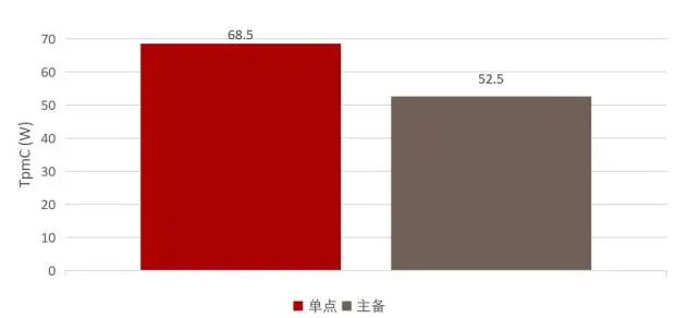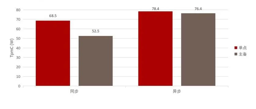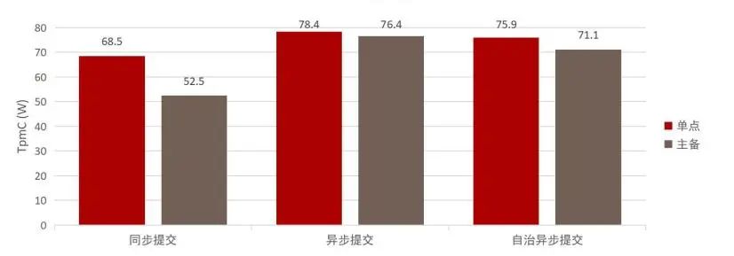 这一方案的优势为性能较好,不受日志落盘速度影响。如下图所示,右侧的异步提交将单点与主备的性能差距大幅缩小,且整体性能有所提升。