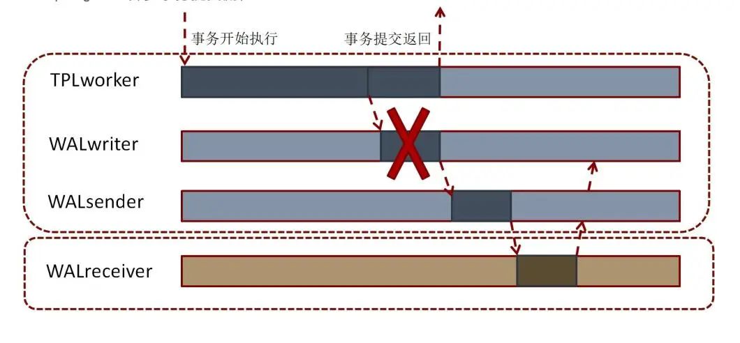 在事务提交流程中,主节点上有三个主要worker线程,WALwriter负责所有数据落盘操作,待数据全部落盘后,再由WALsender把日志发送给备机。等备机完成日志落盘后,事务才可以提交返回。