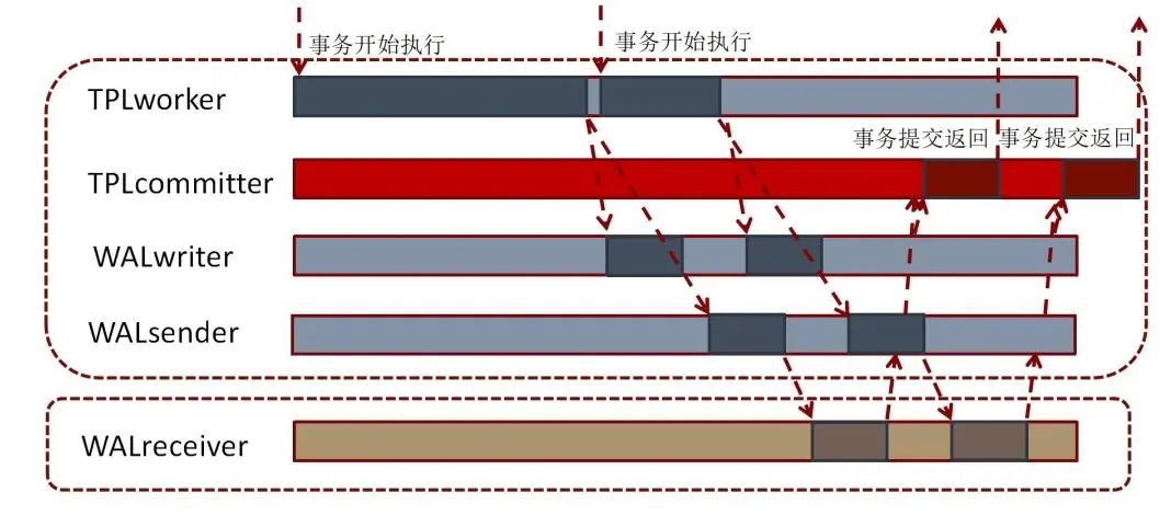 流程细节如上图所示:WALwriter负责日志落盘,WALsender负责将日志发送给备机,备机接收到日志并落盘后,将事务提交信息返回给TPLcommitter线程,再由TPLcommitter完成剩余操作。当新会话进入后,TPLworker就可以无缝处理新会话,从而达到流水线化的效果。