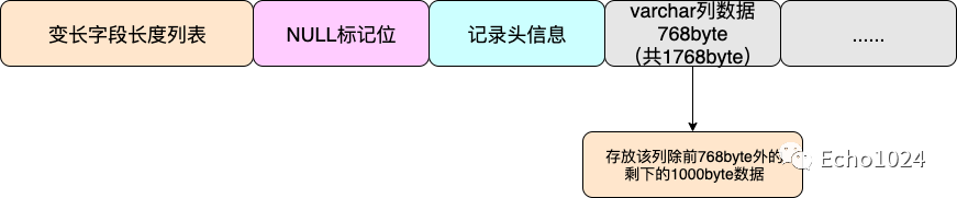 在MySQL设定中,当varchar列长度达到768byte后,会将该列的前768byte当作prefix存放在行中,多出来的数据溢出存放到溢出页中,然后通过一个偏移量指针将两者关联起来,这就是行溢出机制。
