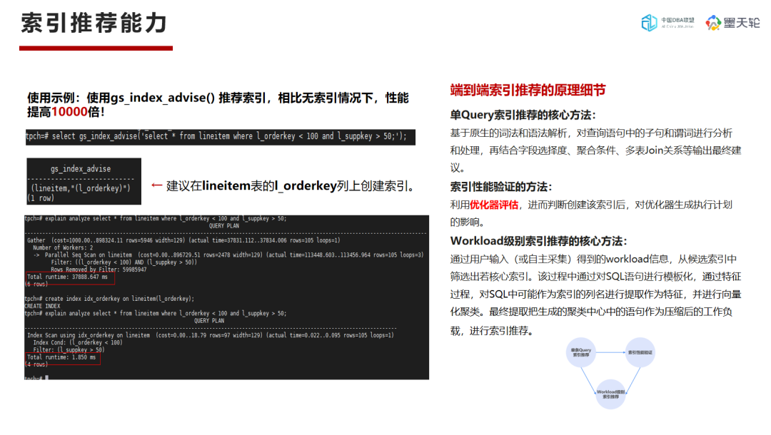索引推荐能力是指在数据库内核中内置单条索引的推荐能力,来实现单条索引推荐,从而让用户很容易对一条语句实现索引加速。由于单条索引很难对整个系统有效,因此openGauss DBMind额外增加了对整个系统负载的索引推荐,通过对批量workload的采集、处理、压缩后再进行单条索引推荐,从而降低索引推荐比例、提升整体效率。