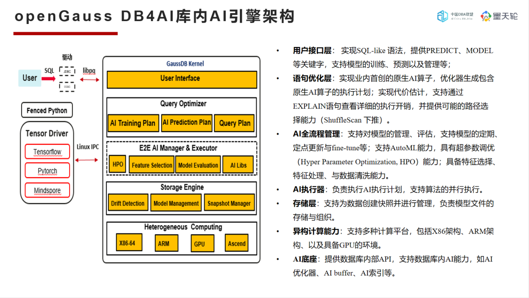 对DBMind整体运维架构进行了详细的介绍后,李士福还分享了库内AI引擎架构和应用方面的知识点。